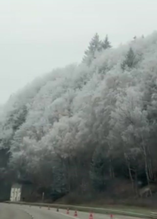 car driving on a highway with a snow-covered forest on the side of the road. There is a tunnel entrance to the left, cones on the road to the right, and other cars further down the highway. The sky is overcast.