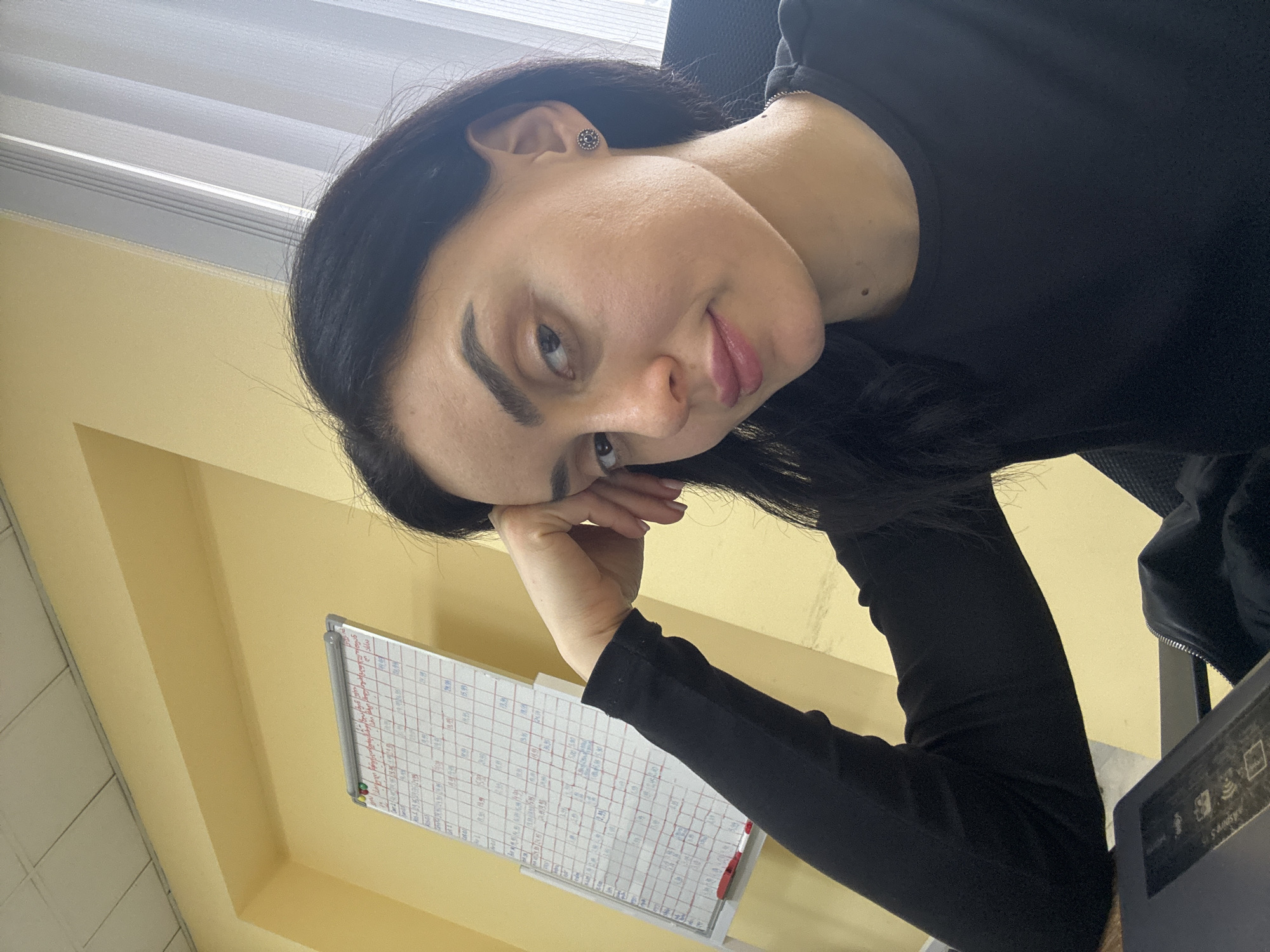 A woman with long, dark hair and fair skin is seated in a room with yellow walls and a white ceiling. She is wearing a black long-sleeved shirt. The woman is resting her head on her hand, looking towards the camera with a slight smile. A whiteboard with writing and a grid of data is visible in the background, attached to the wall. The environment suggests an office setting. The image does not contain sufficient information to determine the location in Tbilisi, Georgia.
