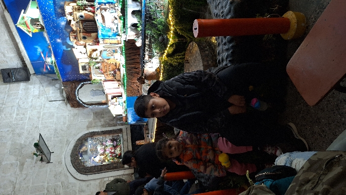 A family visits a Christmas display. A young boy in a black jacket looks at the camera while holding something in his hands. A younger girl in a plaid jacket sits next to him holding a yellow object. Other family members are seated behind them. The display features a large diorama depicting scenes from the Nativity story, along with other decorative elements.