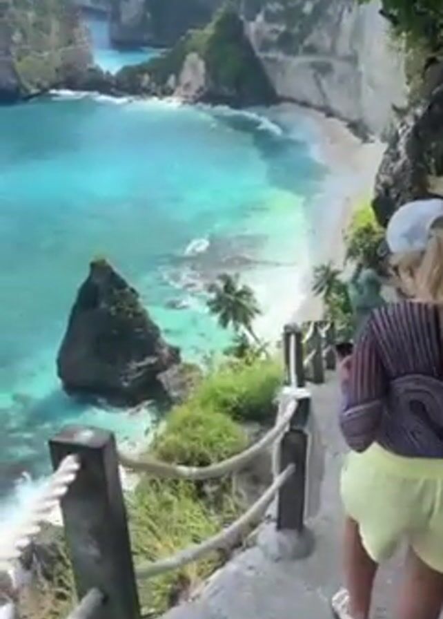 The video presents a scenic view of a tropical beach from atop a cliffside stairway. The turquoise water contrasts with the white sand beach, framed by tall, verdant cliffs. A large rock formation stands in the water, closer to the camera's perspective. Palm trees dot the beach, contributing to the tropical ambiance. A railing lines the stairs for safety, made of wooden posts connected by rope. Several individuals are seen descending the stairs. One woman in the foreground wears a patterned top, yellow shorts, a white baseball cap, and sandals. Another person wears a red baseball cap. One or more of the people on the staircase appear to be using a mobile phone, possibly taking photos or videos. The sky is partly cloudy.