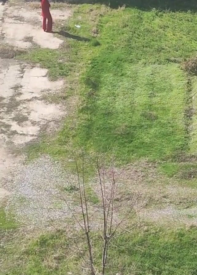 A person in a red outfit stands on a concrete area adjacent to a grassy patch in an outdoor setting. A small, leafless tree stands in the foreground. The ground also has a section of light-colored gravel. The scene appears to be taken from an elevated position.