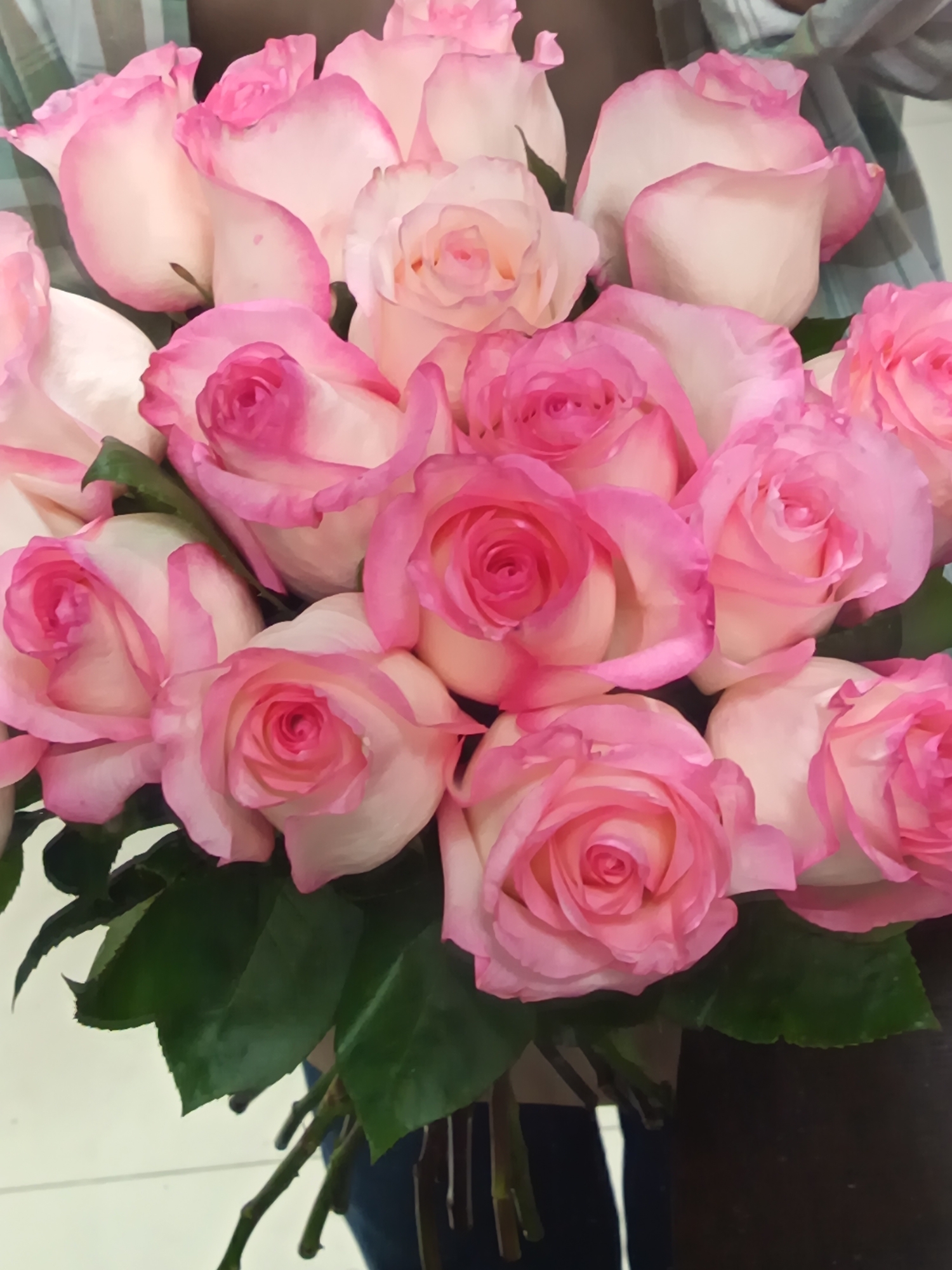 A close-up shot depicts a bouquet of roses. The roses are light pink with darker pink edges. The flowers are in full bloom and the leaves are a deep green. The roses are clustered together and appear to be freshly cut. The background is blurry and out of focus, revealing a hint of light blue and gray fabric above. The specific location of the image within Nizhnevartovsk, Russia is not discernible. There are no people in the image.