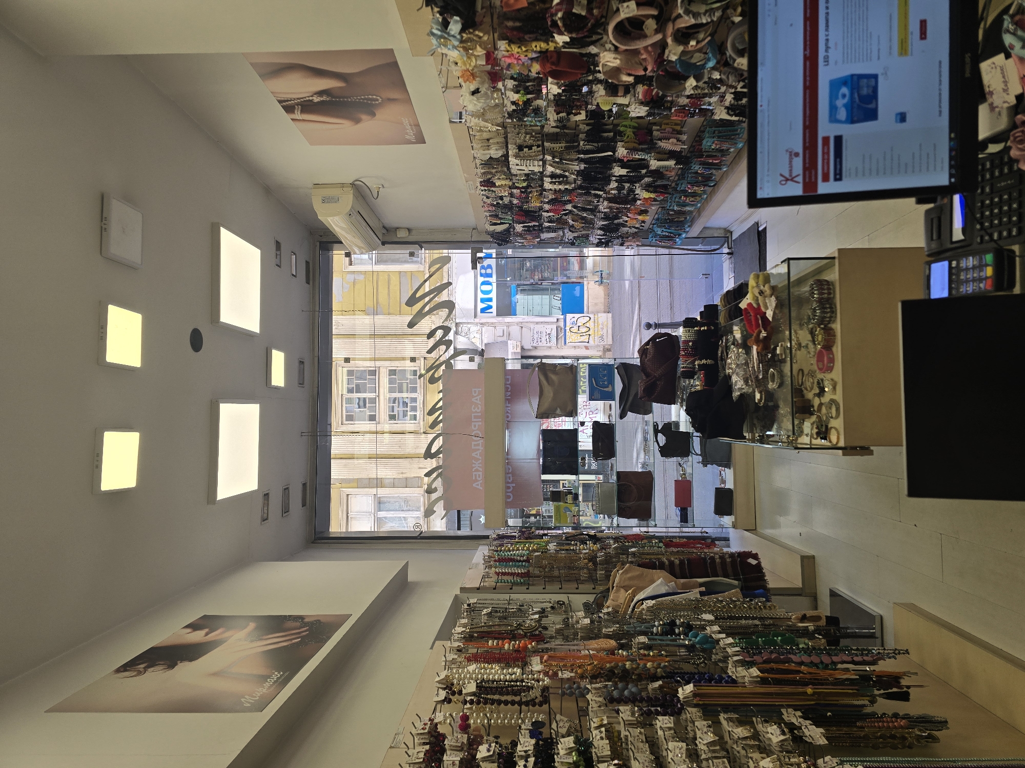 interior of a small shop, seemingly a jewelry or accessories store. Displays with numerous items like hair clips, necklaces, and other trinkets line the walls. A window at the end of the shop looks out onto a street with buildings on the opposite side. Signage in the shop window may contain Cyrillic script, potentially indicating the location as Sofia, Bulgaria. A computer screen and point-of-sale system are visible near the counter.