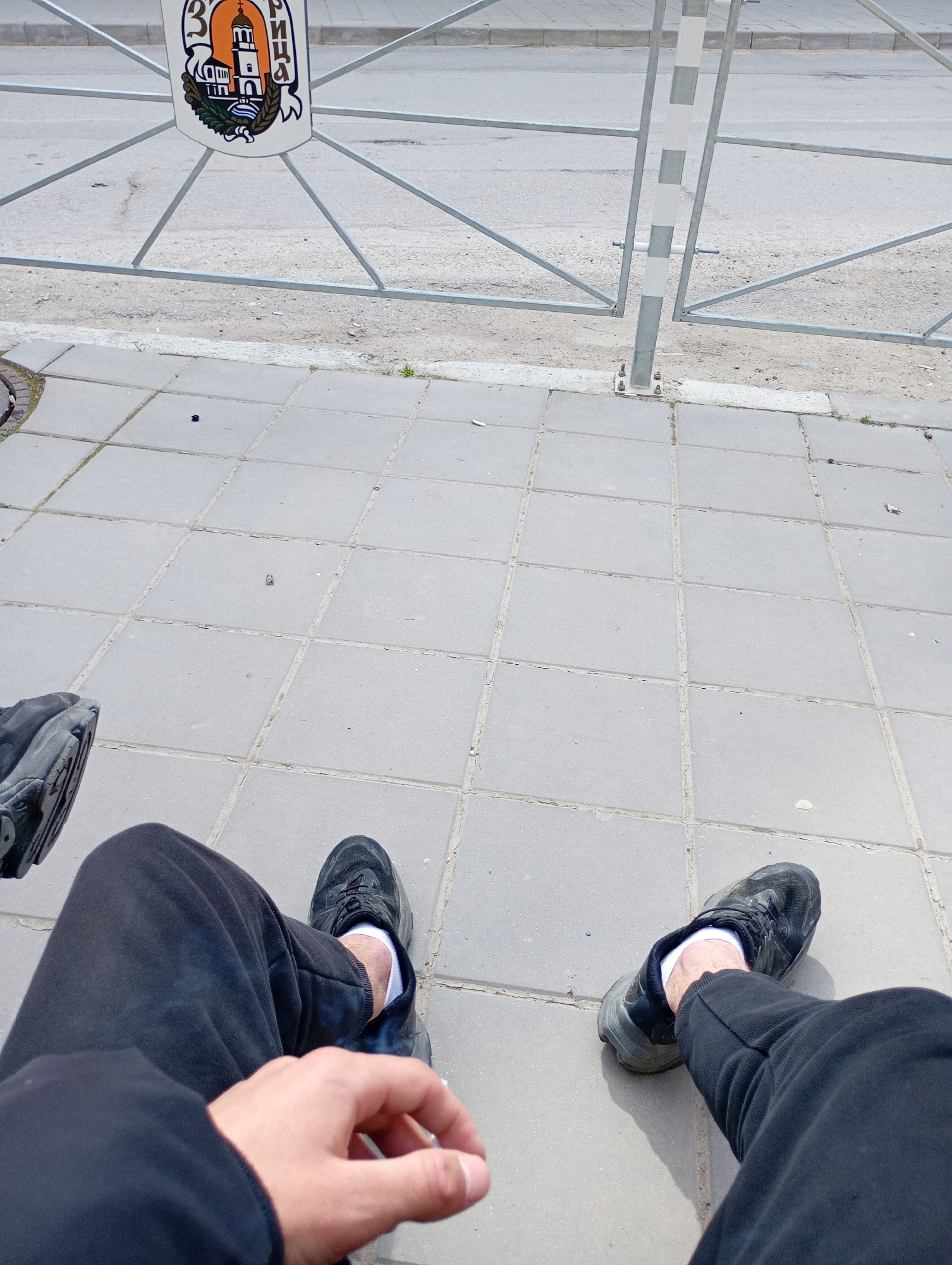 A first-person, eye-level perspective image shows a person sitting, with their legs extended, wearing black shoes with white socks, and dark sweatpants. The person’s hand is visible in the foreground. They are sitting on a grey tiled surface. Behind the person is a metal fence, and beyond the fence is a road. On the fence is a coat of arms of the city of Zlataritsa, Bulgaria. The exact location is likely near an entrance to the city, marked by the coat of arms display.