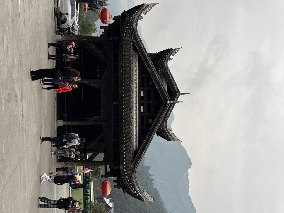 This image displays an outdoor scene in Pengshui Miao and Tujia Autonomous County, China. The central feature is a large, dark-stained wooden traditional Chinese building, characterized by multiple ornate, curved tiled roofs and intricate wooden carvings. The structure appears to be two-storied, with an open lower level. Two prominent red lanterns are suspended from its eaves, one on the left and one on the right. In the foreground, a paved open square is occupied by approximately 15-20 individuals, primarily adults, dressed in casual clothing. They are observed standing, walking, and interacting within the square. To the left of the central building, a silver sedan and a black scooter are parked. On the right, partially obscured by the building and people, a green bus is visible. The background consists of hazy, forested mountains under an overcast, light gray sky. Faint overhead wires are present in the upper portion of the frame.