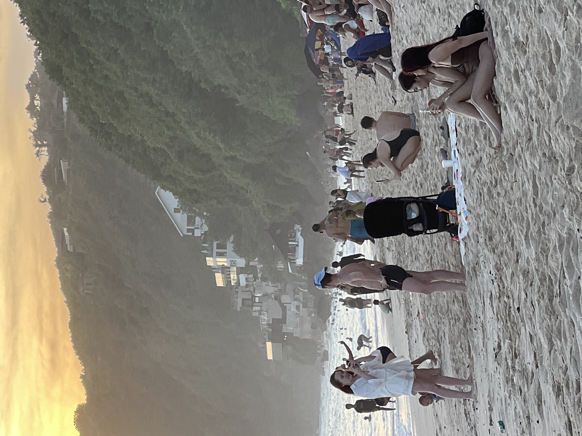 crowded beach in Ungasan, Indonesia. The beach is sandy, with a group of people engaging in various activities such as sunbathing, walking, and taking pictures. The beach is set against a backdrop of lush, green vegetation, and buildings on the hillside are visible. The lighting suggests either sunrise or sunset.