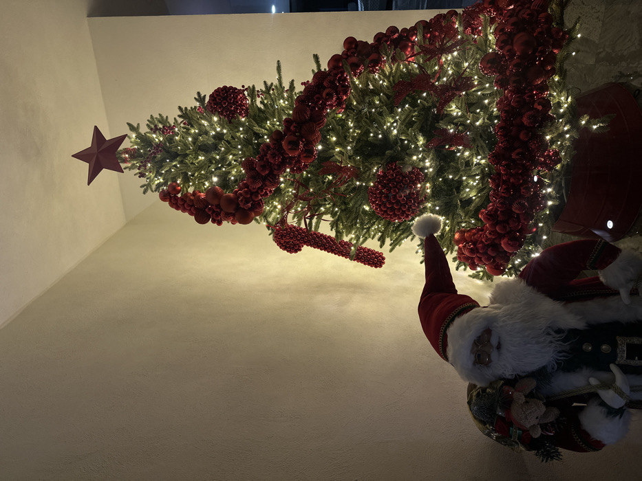 A Christmas tree laden with white lights and red ornaments is tilted in the frame. A large red star tops the tree, which is heavily decorated with red garlands and baubles. A Santa Claus figure in a red suit and hat with a white beard is positioned near the base of the tree. A red sled and other Christmas decorations are visible near Santa. The tree and decorations are against a light-colored wall, with a sense of perspective looking up at the tree.