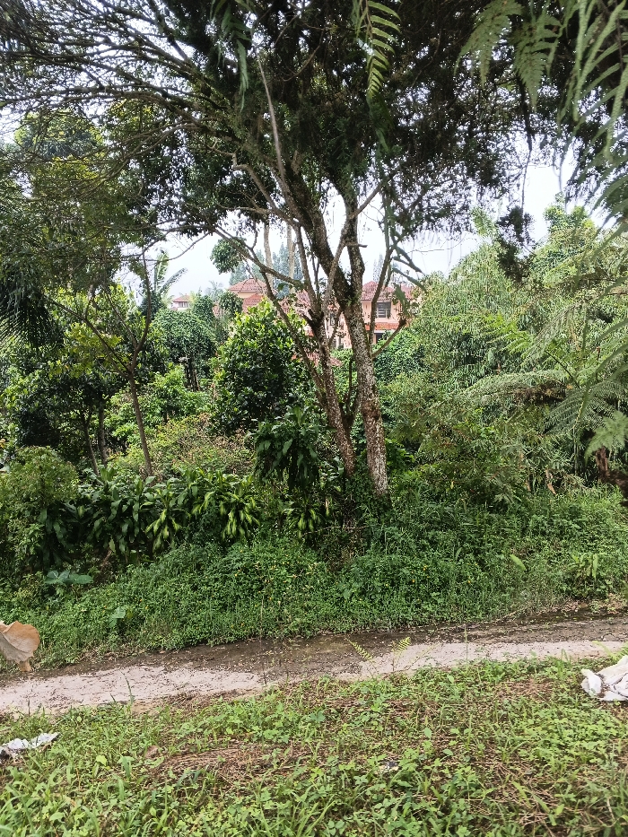 The image depicts a verdant, overgrown landscape in Candelaria, Philippines, under an overcast sky. A narrow, unpaved dirt path runs horizontally across the lower third of the frame. The ground immediately bordering the path is covered in green grass and various low-lying plants. On the far left, a light-colored, tan object is partially visible at the edge of the frame, while on the far right, a crumpled white object rests near the path. The midground and background are dominated by dense tropical vegetation, featuring numerous trees with visible trunks and branches, broad-leafed plants, and ferns. Partially obscured by the foliage in the upper background, a multi-story building with a distinctive reddish-brown tiled roof and light-colored walls is visible. No individuals or active interactions are present in the static scene.