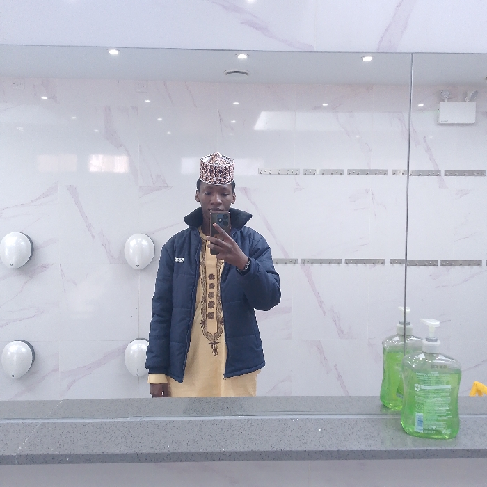 The image displays a male individual taking a mirror selfie in a public washroom. The specific location within Birmingham, United Kingdom, cannot be identified from the visual data. The individual, appearing to be of African descent, is seen from approximately the chest up. He holds a dark-colored smartphone in his right hand, pointed towards his reflection in the mirror. His expression is neutral. He wears a dark blue puffer jacket over a light yellow or beige long-sleeved tunic featuring brown embroidered patterns around the neckline and chest. On his head, he wears a multi-colored, intricately patterned cap. The washroom environment is brightly lit with recessed ceiling lights. The walls are clad in large, light-colored tiles exhibiting subtle reddish-brown marble-like veining. On the wall to the left of the individual's reflection, three white, oval-shaped electric hand dryers are mounted vertically. On the right side of the mirror's reflection, several horizontal metallic strips, possibly coat hooks, are affixed to the tiled wall. A long, grey, speckled countertop runs across the foreground beneath the mirror. On the right side of this countertop, two transparent green liquid soap dispensers with white pumps are visible. A yellow object is partially visible behind them.