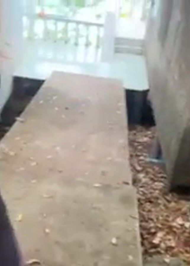 A woman wearing a black sports bra and dark shorts stands outside in a tropical location. The camera pans up to show two small buildings with a narrow walkway between them. The walkway leads to a white balcony overlooking a body of water. The camera reveals trees and rooftops. The overall scene suggests a tropical resort or similar location with small, rustic buildings near the water.