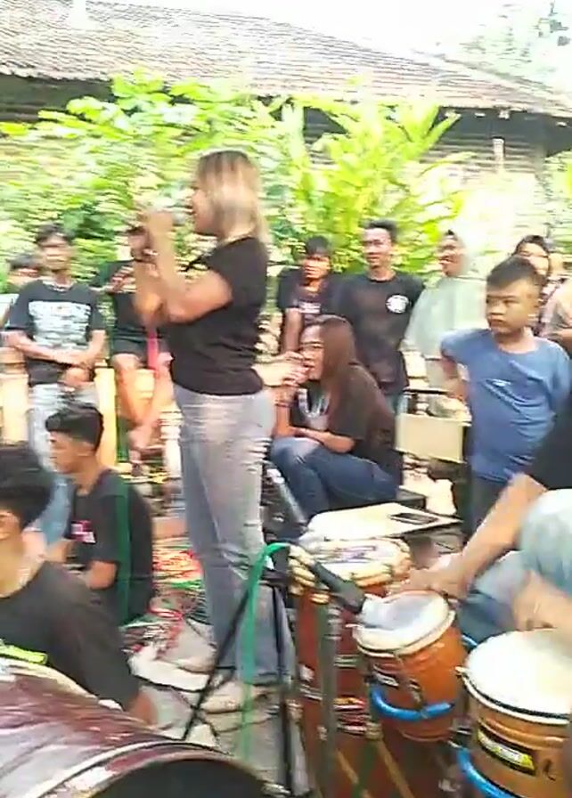 A group of young adults are playing musical instruments in an outdoor setting. Some of them are sitting and playing hand drums, while others are standing and appearing to sing. The setting appears to be a backyard or patio with foliage and a tiled roof visible in the background. Microphones and other equipment are also visible. The scene conveys a sense of casual music making, possibly a rehearsal or informal performance.