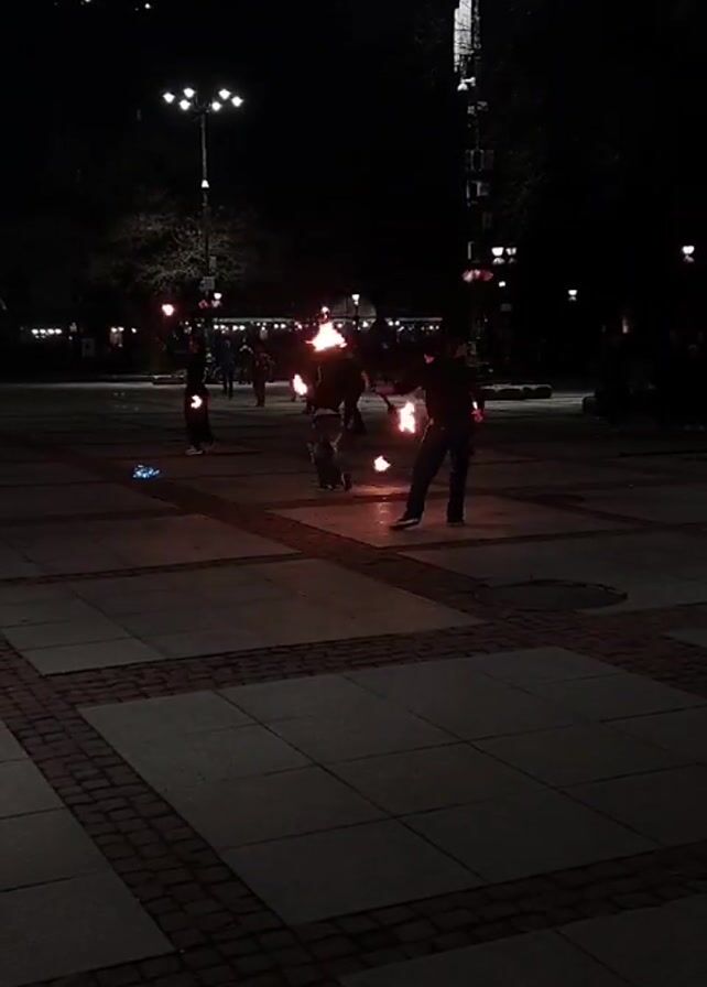 At night, several individuals engage in fire performing in a public square. The performers, who appear to be standing a good distance apart, skillfully manipulate burning torches. The square is illuminated by street lamps, and a building bearing the sign "GRAND HOTEL SOFIA" is visible in the background. The ground is paved with a patterned mix of light and dark stones.