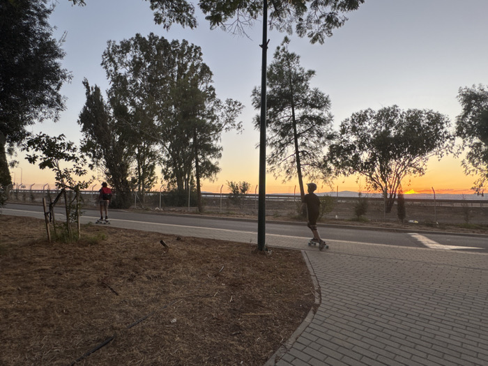 This image captures an outdoor scene at sunset in the Gilboa Regional Council, Israel. Two individuals are depicted longboarding. The individual in the foreground, on the right, wears a dark shirt, dark shorts, and a helmet, and is actively riding a longboard on a light-colored paved pathway made of interlocking pavers. A dark street light pole is positioned to the left of this individual. To the left of the paved path, an expanse of dry, brown earth with sparse vegetation and some debris is visible. Further back and to the left, a second individual, wearing a red backpack and light-colored shorts, is also riding a longboard on a paved asphalt road that runs parallel to the foreground path. This road is separated from the background by a wire fence. The background features numerous trees of various types and heights, including tall, slender trees and broader-canopied trees. The sky displays a vibrant sunset, transitioning from light blue overhead to intense orange and yellow hues at the horizon, silhouetting distant hills or mountains.