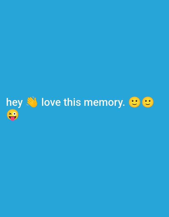 A light blue background showcases the text "hey 👋 love this memory. 😊😊😜". The text is centrally aligned. A waving hand emoji substitutes the word "love". Two smiling face emojis and a face with a tongue sticking out emoji complete the phrase. The font appears sans-serif and is likely a digital rendering intended for screen display.