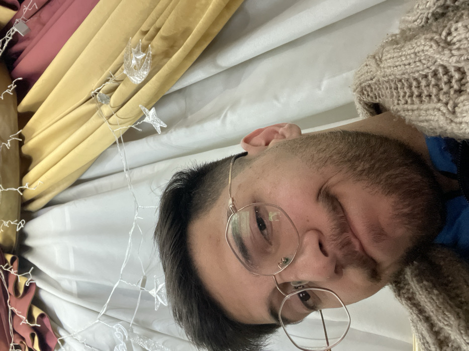 The image depicts a close-up, upward-angled view of an adult male indoors, located in Sarouja Municipality, Syria. The male, facing the camera directly, possesses short dark hair, a trimmed beard, and a mustache. He wears polygonal-framed glasses with thin metallic frames and exhibits an expression with puckered lips. His attire includes a light-colored, possibly beige or cream, cable-knit sweater worn over a blue shirt. The background consists of layered curtains in shades of white, gold, and burgundy, arranged with decorative drapes. Strung across the top portion of the curtains is a string of clear festive lights featuring transparent plastic ornaments shaped like stars and crescent moons. No other individuals or direct interactions are visible.