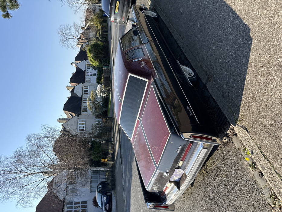 - "A vintage, two-tone (maroon roof and trunk over black body) 1970s Cadillac Coupe de Ville, bearing UK registration plate RHG 74R, is parked curbside on a residential street" by FM-oH6mZ2, licensed under CC BY 4.0