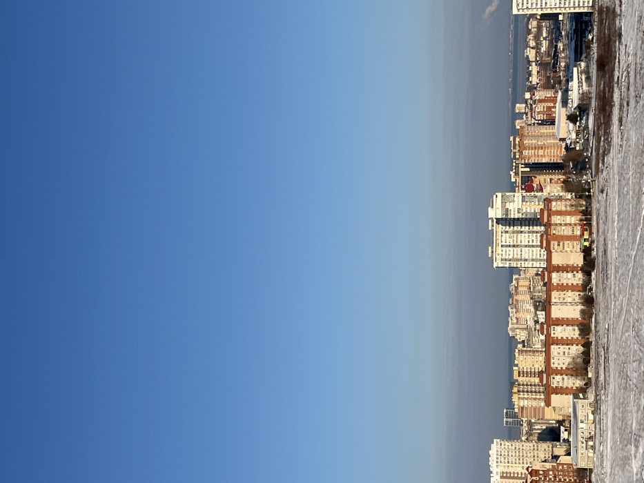 A city skyline is aligned vertically on the right side of the image, with buildings of varying heights and colors, mainly light beige and white. Some structures have red accents. A strip of light grey, possibly water or haze, separates the city from a large expanse of clear blue sky filling the majority of the scene. The lower right section shows a textured surface, likely a snowy or icy area near the city. The overall composition emphasizes the contrast between the urban landscape and the open sky.