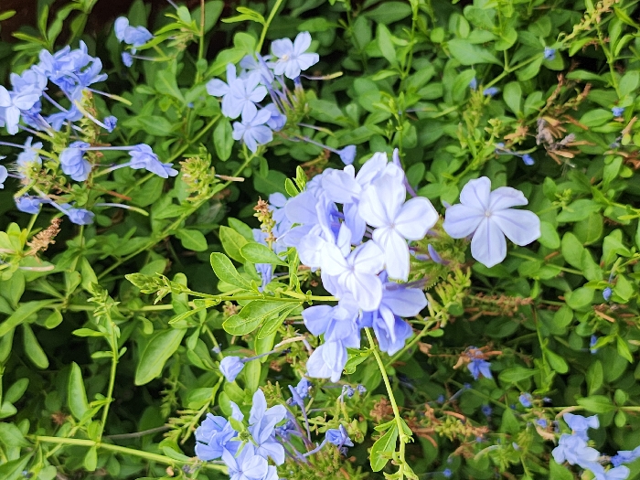 - "A vibrant display of blue plumbago flowers dominates the scene, intermingling with lush green foliage" by FM-FRAqu1, licensed under CC BY 4.0