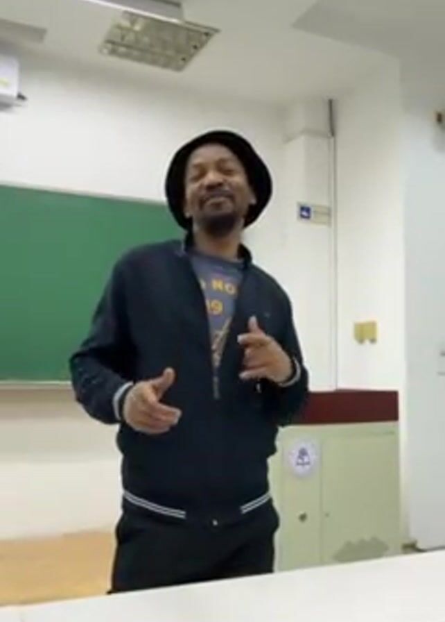 A man stands in what appears to be a classroom. He is wearing a dark blue zip-up jacket over a gray t-shirt, dark pants, and a dark-colored hat. He gestures with both hands. Behind him is a green chalkboard and a tan-colored cabinet with a logo on it. The room is lit with fluorescent lighting. The floor is wooden. There is a white table in front of him.
