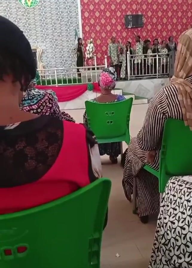 The video depicts a church service in a brightly lit interior. Seated attendees, whose backs are mostly visible, occupy green chairs in the foreground. On a raised platform at the front, a choir, led by a woman, is performing. The backdrop consists of a patterned wall and the church's emblem is seen on the left. The setting appears to be a formal event.
