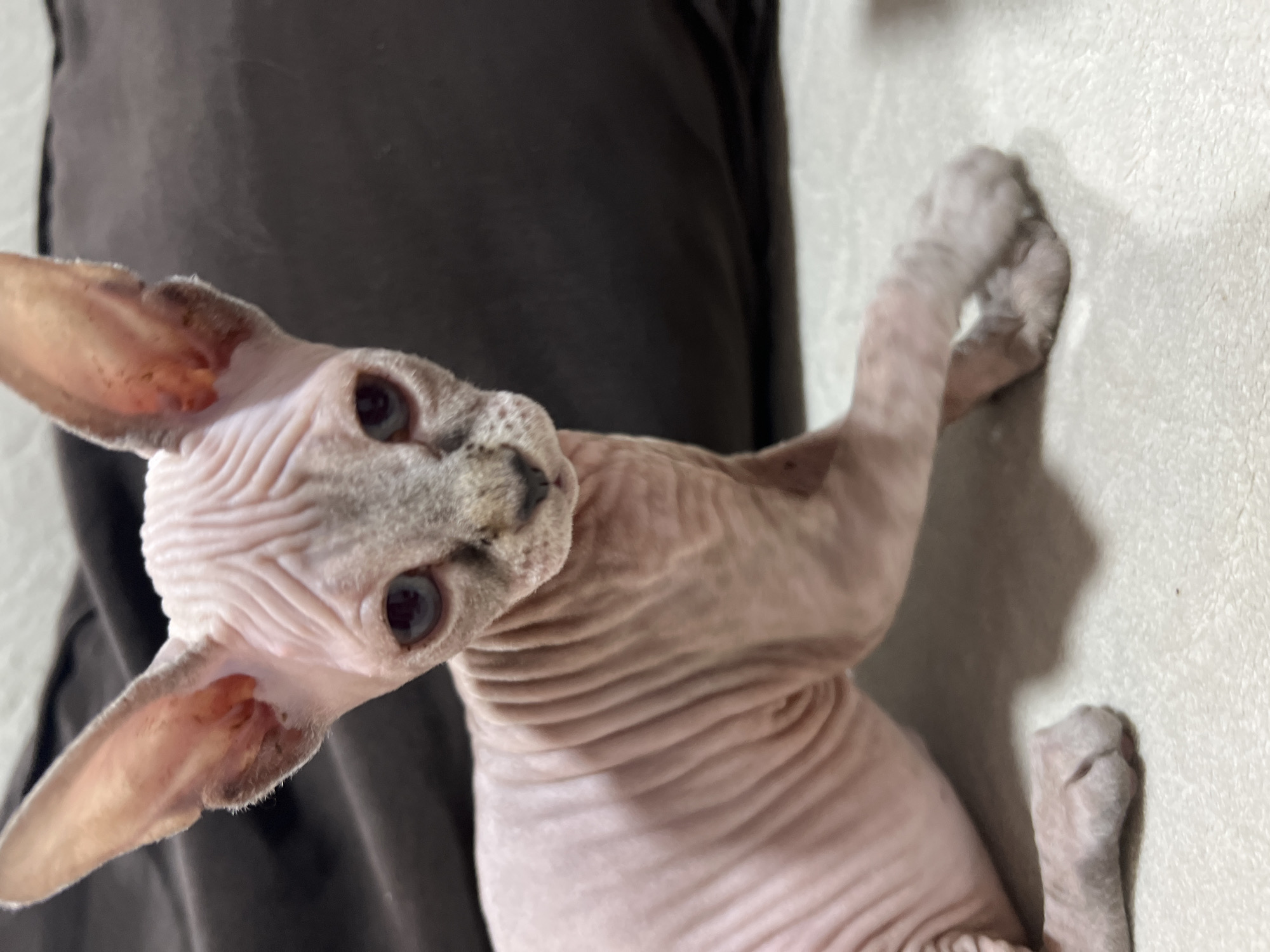 A Sphynx cat with pink skin and blue eyes is positioned close to the camera, angled upwards to the left. The cat is pressing its front paws against a light-colored wall. A dark garment is visible in the background behind the cat. The surrounding environment is not identifiable as Chemoshur, Russia.