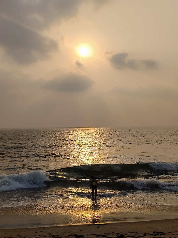 The image depicts a coastal scene in Querim, India, during either sunrise or sunset. The sun, appearing as a bright, luminous disc, is positioned in the upper left quadrant of the sky, partially obscured by light, hazy clouds. This casts a pervasive golden-orange light across the environment. A prominent, intense golden reflection of the sun is visible on the water's surface, forming a shimmering path from the horizon to the foreground. The body of water shows numerous small to medium waves, with several exhibiting white crests as they break near the shore. In the shallow water, a single human figure stands in silhouette, facing away from the viewer, looking towards the horizon. The individual appears to wear a light-colored top with a circular emblem on the back and dark lower garments. The immediate foreground consists of dark, wet sand, which also reflects the golden light. A small, dark piece of debris lies on the sand in the lower right portion of the frame.