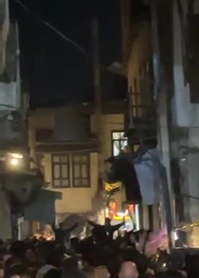 A large crowd of people is gathered in a narrow alleyway at night. The buildings on either side appear to be old and rundown. There are several people in the crowd raising their arms, possibly cheering or celebrating. The lighting is dim, with a few streetlights and some lights emanating from the buildings. A tall, thin, dark structure rises above the buildings. The overall mood seems festive or celebratory.