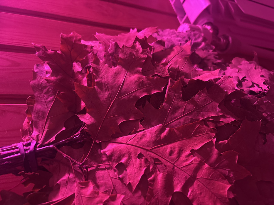 A dense bundle of dried, lobed leaves, consistent with oak leaves (Quercus species), is depicted in a close-up, vertically oriented photograph. The leaves are bound together at their stems by a thin, dark tie, forming a structure commonly known as a venik. The entire scene is illuminated by an intense, artificial magenta light source, rendering all visible elements in shades of deep pink and fuchsia. The lighting highlights the intricate venation and textured surfaces of the individual leaves, and casts soft shadows within the bundle. The background consists of vertically oriented wooden planks, also saturated with the magenta light, indicating an indoor environment likely to be a sauna or banya. No individuals, overt actions, or interactions are visible. The image itself contains no discernible markers to identify a specific location within the city of Kharkiv, Ukraine, though the presence of a venik aligns with cultural practices in the region.