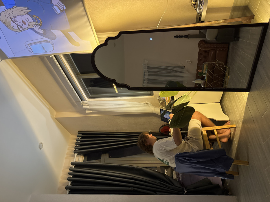 A room features a person sitting on a wooden chair working on a laptop near a window with dark curtains. A large mirror reflects a different room containing a leather sofa, a table, and white curtains. Above the mirror, a projector screen displays a cartoon image. The room appears to be well-lit, with light sources on the ceiling and from the window. A plant sits on a white desk near the mirror.