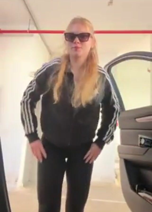 A fair-skinned young woman with long blond hair is posing in front of a car in a parking garage. She is wearing black leggings, a black jacket with three white stripes on the sleeves, a light-colored shirt, sunglasses, and gray shoes. She holds poses with her hands on her hips and a foot lifted. The car door is open behind her. The garage has a white ceiling with exposed pipes and a white concrete floor.
