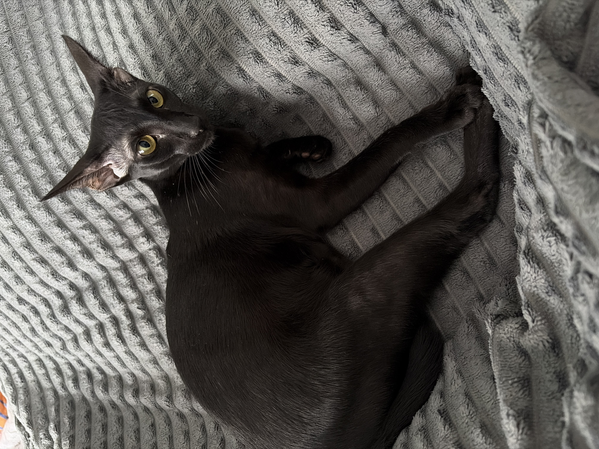 This image displays an indoor scene featuring a black domestic cat, consistent with an Oriental Shorthair breed, resting on a textured grey blanket