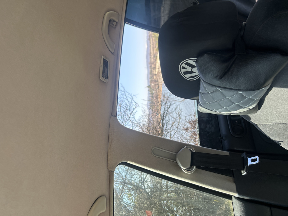 The image provides an interior view from a vehicle, looking out onto a landscape identified as Verinsko, Bulgaria. The vehicle's interior features a light beige headliner with a roof-mounted light unit and a passenger grab handle on the right. On the left side of the frame, a black seatbelt with a metallic buckle is visible, unfastened and suspended from a beige B-pillar. Centrally, a black automotive headrest displays a white Volkswagen logo, positioned above a quilted grey and black lumbar support cushion attached to a seat. Through the vehicle's windows, the external environment is visible under clear blue skies. A large body of water dominates the mid-ground, with bare-branched trees lining its immediate bank. Across the water, several residential structures are discernible, backed by distant rolling hills that form the horizon. The entire outdoor scene is illuminated by direct sunlight.