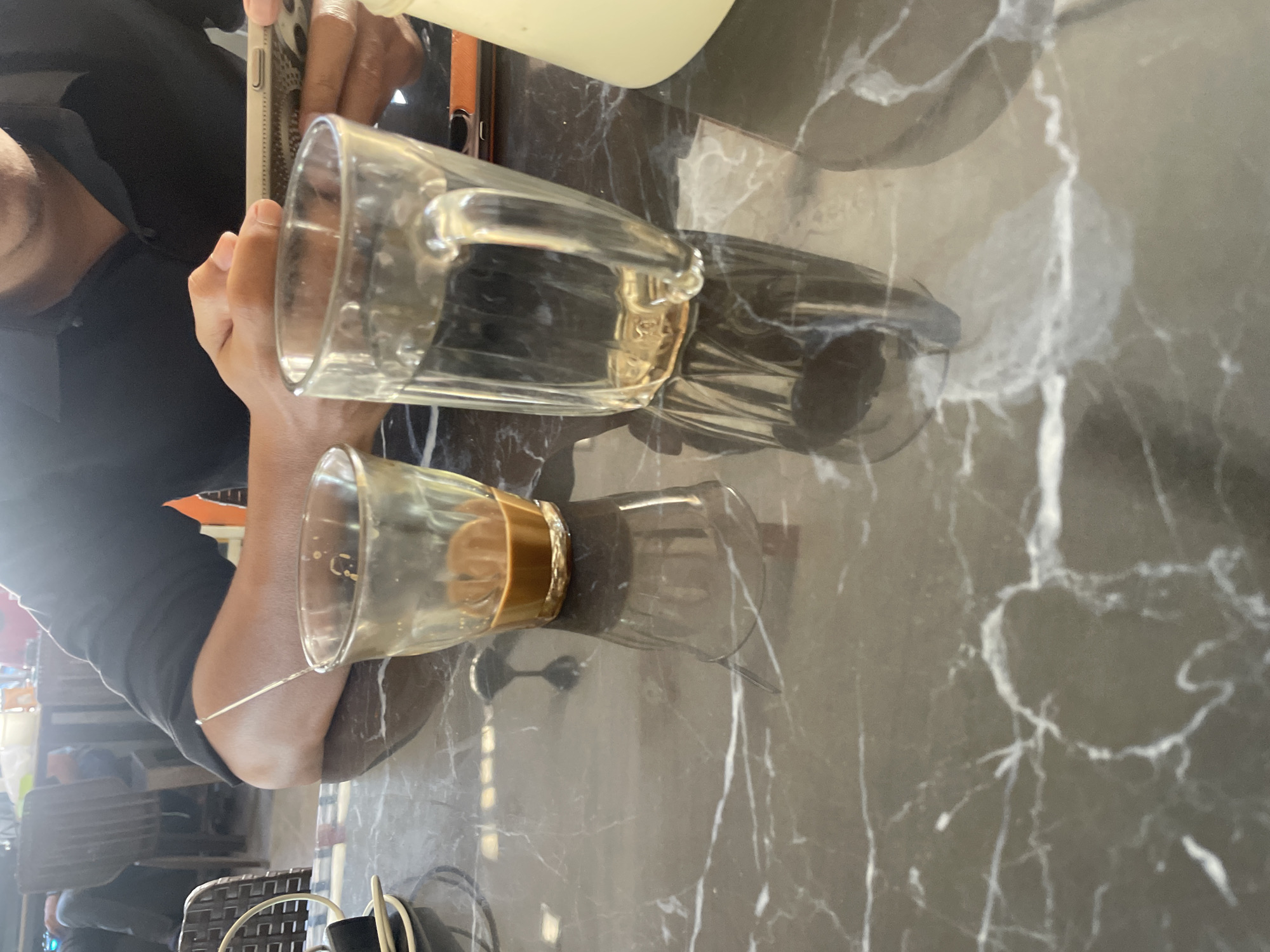 An individual is seated at a dark, highly reflective marble-patterned table in what appears to be an indoor establishment, likely a cafe or restaurant, in Langsa, Indonesia. The person wears a black collared shirt and is actively engaging with a light-colored smartphone, held with both hands. On the table, two clear glasses are present: one small glass containing a residual dark brown liquid, and a larger handled mug filled with clear liquid. A coiled white cable and a black rectangular object (possibly a charger or power bank) are also visible on the left side of the table. The background is blurred, revealing additional dark wooden chairs and tables, suggesting other patrons or seating arrangements within the venue.