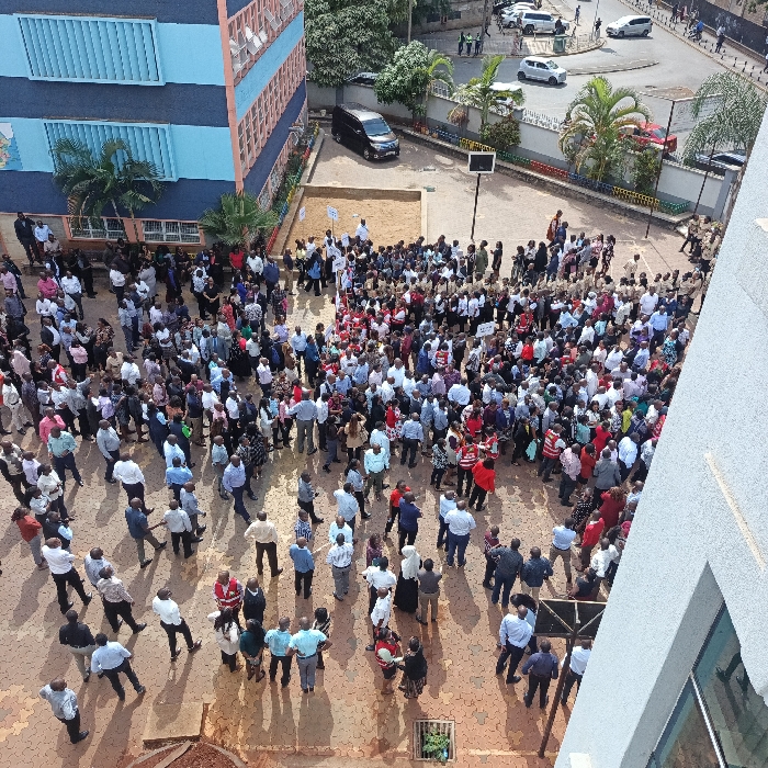 This overhead image depicts several hundred individuals gathered in an outdoor paved courtyard within an urban area of Nairobi, Kenya