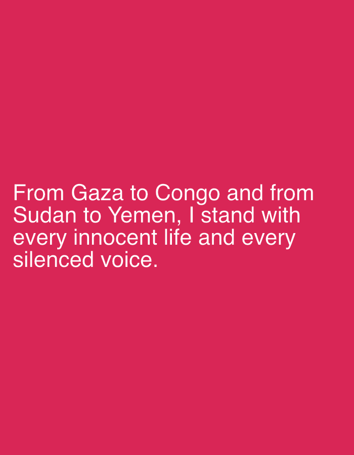 This digital image presents a textual statement against a solid deep pink background. The white, sans-serif text is centrally aligned in the lower half of the frame and reads: "From Gaza to Congo and from Sudan to Yemen, I stand with every innocent life and every silenced voice." No individuals, actions, or specific environmental features beyond the colored background and text are depicted. This static graphic is described as being situated in Saint-Germain-en-Laye, France.