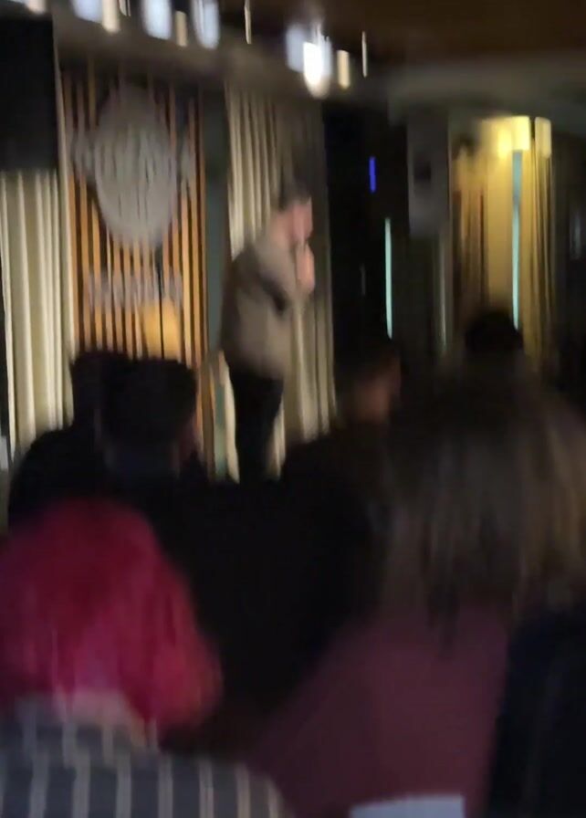 A man is performing stand-up comedy on a small stage in a Hard Rock Cafe, presumably in Podgorica based on the sign. The man is wearing a dark jacket and pants, holding a microphone. An audience sits facing him, with a person with bright pink hair in the front row. Lighting fixtures are visible on the ceiling, and a speaker stands beside the stage. The room appears dimly lit and casual.
