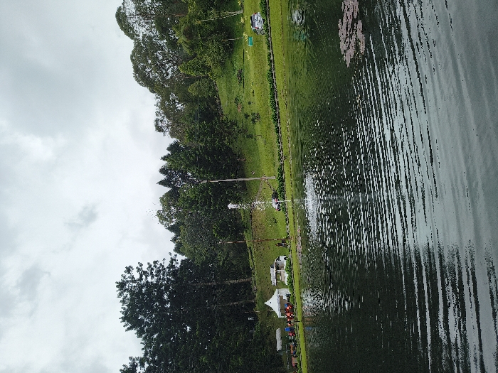 A scenic view features a tranquil lake mirroring a cloudy sky. Lush green vegetation lines the lake's edge, transitioning from grass to a dense forest. A fountain in the lake sends water spraying into the air. Tents and gatherings of people are visible near the shoreline, suggesting an event or park area. The image is oriented sideways.