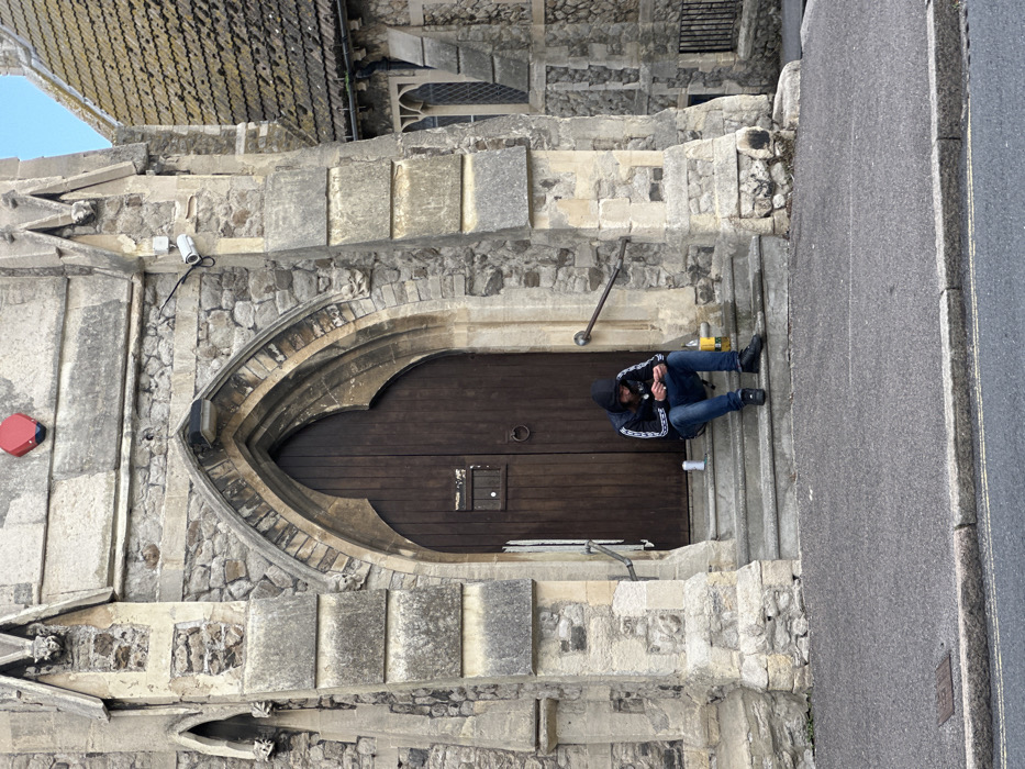 This image depicts the west entrance of St George's Church in Ramsgate, within the district of Thanet, United Kingdom, during daylight hours. A single individual is seated on the second of three stone steps leading up to a large, dark brown arched wooden door. The building is constructed from rough-hewn grey stone, featuring Gothic architectural elements such as pointed arches, buttresses, and decorative carvings on pinnacles. A red rectangular alarm siren is mounted high on the facade above the main arch, with a white CCTV camera positioned to its right, angled downwards. The arched wooden door has a large circular metal handle and a smaller square opening with a metal plate. A simple, dark-colored metal handrail is affixed to the stone wall on the right side of the steps. To the right of the main entrance, a section of an adjacent stone structure with a tiled roof and an arched window is visible. The seated individual, appearing male, is wearing a dark hooded jacket (with white stripes on the sleeves), dark blue jeans, and dark footwear. The hood is up, obscuring most of their head, but a beard is visible. The person is looking down at their hands, which are occupied with a small, light-colored object, possibly rolling a cigarette or handling a small item. A white aerosol can or similar container rests on the first step to the individual's left, and a yellow container, possibly a bottle or can, is on the second step to their right. The immediate foreground shows a dark grey asphalt pavement with a light grey curb stone, indicating a street or pathway adjacent to the church steps. The sky above is clear and light blue.
