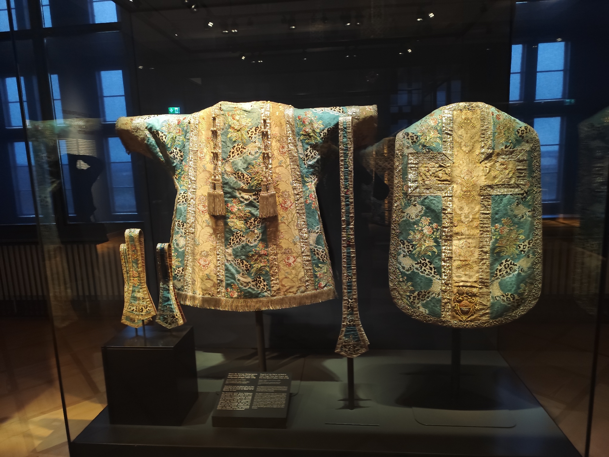 The scene captures three richly embroidered ecclesiastical vestments displayed within a clear glass case inside a museum in Aschaffenburg, Germany, likely the Stiftsmuseum der Stiftskirche St. Peter und Alexander. The central subjects are a dalmatic or tunic and a chasuble, accompanied by two smaller fabric liturgical pieces. The garment on the left is a dalmatic, a short-sleeved vestment with open sides, displayed on a dark, slender stand. It is made of intricate fabric featuring vertical gold-embroidered bands adorned with tassels and floral motifs, interspersed with teal-blue sections patterned with a leopard-spot design and additional floral embroidery. A gold fringe borders its lower edge. To its right, the chasuble, a rounded, poncho-like outer vestment, is displayed from the rear, also on a dark stand. Its back features a prominent gold-embroidered cross design, richly decorated with floral and geometric patterns, set against the same teal-blue and leopard-spot fabric. To the left of the dalmatic, two smaller, similarly ornate fabric strips, possibly manipules or stoles, are presented on miniature dark stands. All items are set against a dark background within the display case. A dark rectangular information plaque, with white text partially visible (referencing "Orden der Monsignore..." and "1779"), rests on the dark display base in front of the dalmatic. Reflections on the glass display case reveal a large, multi-paned window with internal blinds or coverings, a green emergency exit sign, and general ambient light from the museum environment. No individuals are depicted as subjects in the scene, nor are any actions or direct interactions observable.