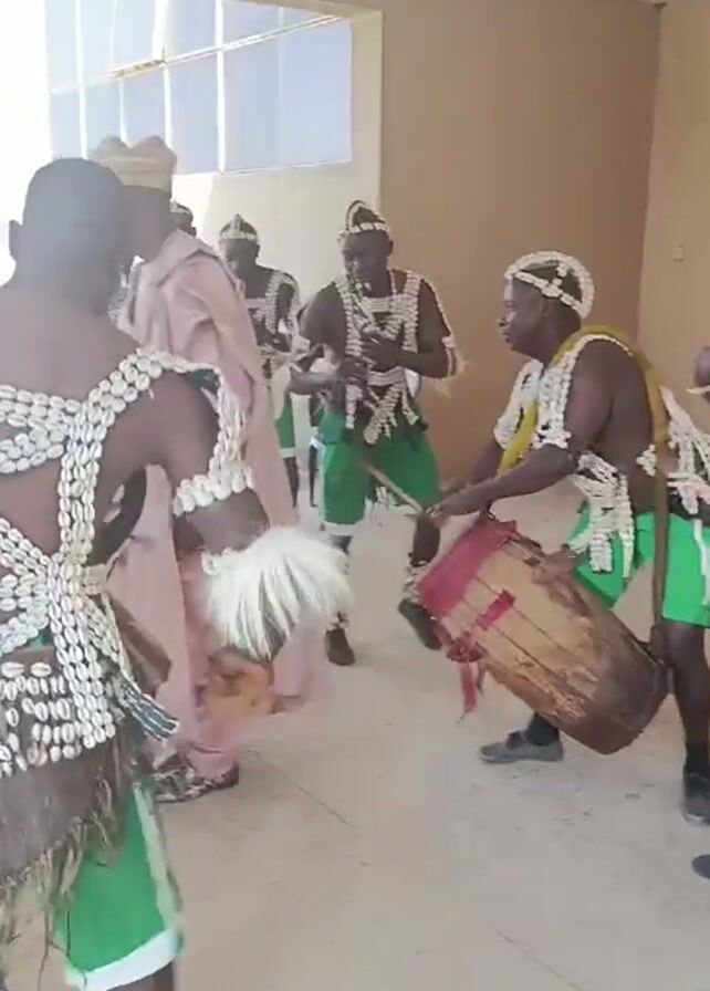 A group of African men wearing traditional costumes perform in front of a building. The men wear matching green and brown costumes decorated with white seashells, and matching headdresses. One man plays a large drum, while another plays a wind instrument. Another man shakes a white feather duster. They are all moving and dancing to the music. A person in a light pink robe and white hat stands to the side, watching the performance. The building behind them has large windows. The overall atmosphere is celebratory.