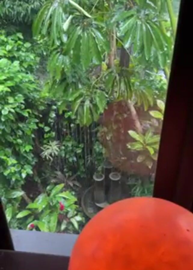 A view from inside a building looking out a window onto a lush, green garden. It is raining heavily, and the raindrops are visible against the greenery. In the foreground, near the bottom of the frame, is a glowing orange sphere. The window frame is dark. The garden includes various types of plants and trees, some with large, palm-like leaves. In the center of the garden, there's a decorative element featuring several cylindrical objects arranged in a circle. The scene is still, capturing the tranquil yet intense atmosphere of a rainy day.