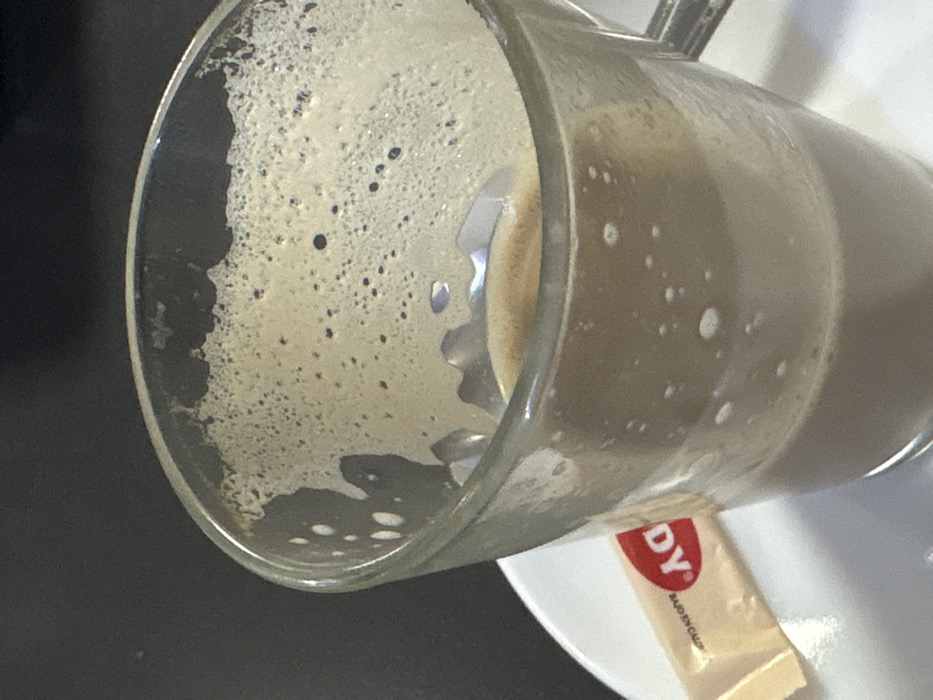 A close-up shot shows a glass mug angled slightly. Inside, coffee with a thick layer of foam coats the glass, leaving a speckled residue. The mug sits on a white saucer. A sugar packet with the "DY" logo is visible on the plate beside the mug. The background is dark, contrasting with the mug. The overall image is well-lit, highlighting the textures of the coffee and foam.