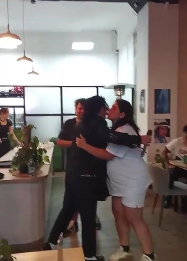 Michael Jackson impersonator being greeted enthusiastically in what appears to be a restaurant or cafe. Inside the cafe, two people, including a woman in a white t-shirt and shorts, embrace the impersonator, who is dressed in a black suit. Someone is taking pictures. Other people are sitting at tables nearby. The interior is brightly lit with pendant lights and has some plants as decor.
