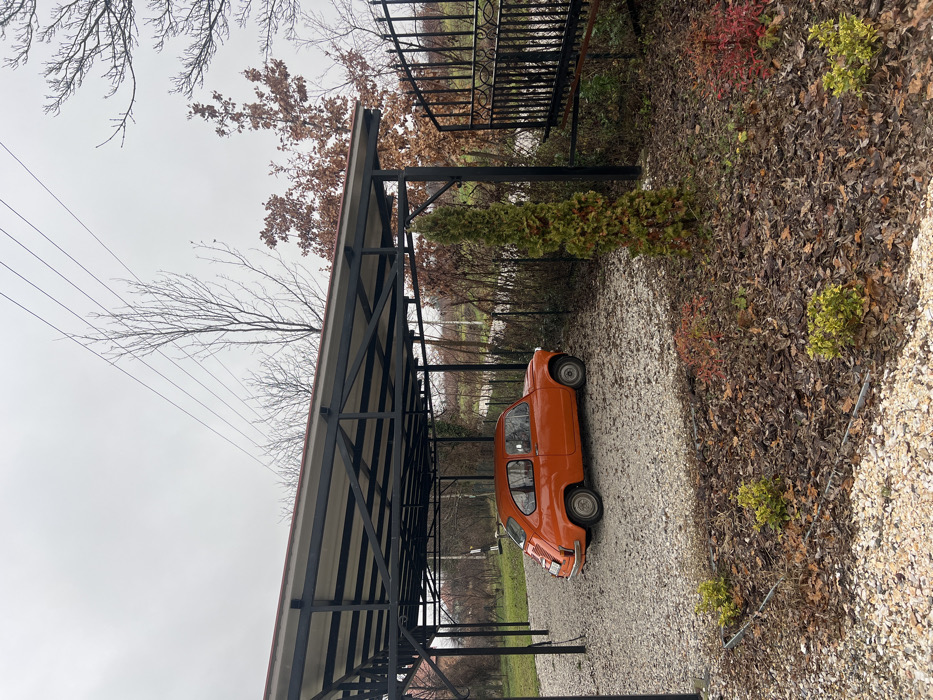 An outdoor scene in Topola Municipality, Serbia, depicts a late autumn or winter setting under an overcast sky. In the midground, a black metal carport with a light-colored, possibly corrugated roof, shelters an orange vintage two-door compact car, consistent with a Zastava 750 model. The car is parked on a light grey gravel surface, oriented with its rear towards the viewer and front facing left. To the right of the carport, a tall, slender green conifer stands adjacent to a partially open black ornate metal fence or gate. The foreground features a garden bed covered in dark brown fallen leaves, interspersed with small green and reddish bushes. The background includes numerous bare deciduous trees and some trees retaining brown foliage. Overhead power lines and utility poles are visible against the uniformly grey sky. No individuals are present in the image.