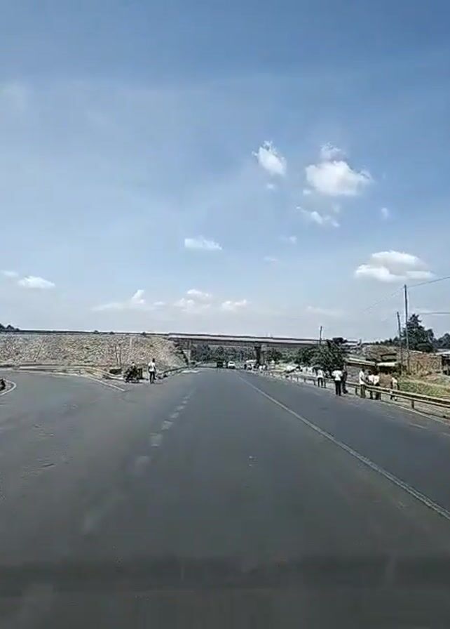 drive on a gray asphalt road under a bright blue sky with puffy white clouds. A bridge spans the road ahead. The road appears to be a highway, marked with white lines, and there are pedestrians on both sides of the road near the bridge. On the right side of the road, there is a row of buildings, and on the left side, there's a roadside barrier. A few vehicles are driving on the road under the bridge. The camera is positioned inside a car, capturing the view through the windshield.