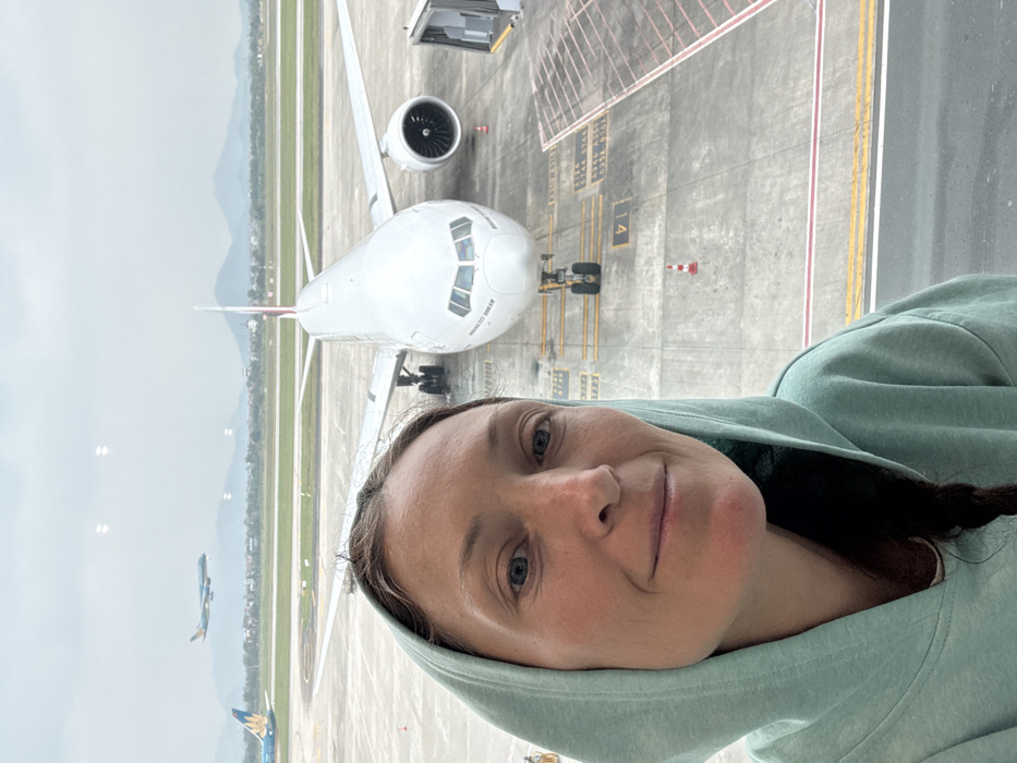 A selfie-style portrait shows an adult female in the foreground, positioned indoors behind a window at an airport
