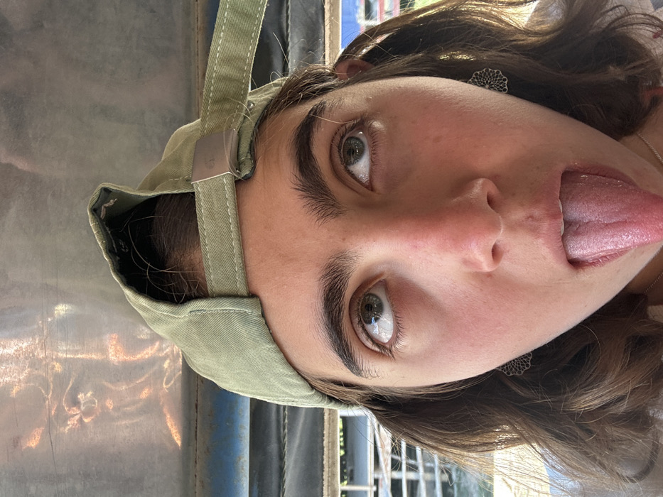 A woman wearing a light green baseball cap tilted slightly back and angled to the left sticks her tongue out. She has light brown hair and fair skin with a rosy hue on her cheeks. The woman's eyes are light brown and looking upwards. A silver earring with a floral design is visible on the right side of the frame. A section of what looks like metallic sheeting is behind the woman.