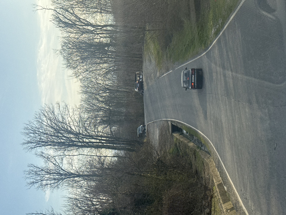 The image depicts an uphill asphalt road scene in Verkhnevesyoloye, Russia, under an overcast sky with patches of blue. In the immediate foreground, the viewer's perspective is on a paved two-lane road with white shoulder markings. A dark-colored sedan, featuring a Russian license plate M367HM 93, proceeds uphill away from the viewer. To the left of the road, a concrete drainage ditch containing standing water runs parallel to the road. Further uphill, at the crest of the road, two vehicles are parked on the unpaved shoulder area. On the left, a dark-colored SUV is parked. To its right, a dark-colored coupe with a prominent, large, light-colored rear spoiler is also parked. Both sides of the road and the background are densely forested with bare deciduous trees and shrubs, indicative of a leafless season. Patches of green grass are visible on the road verges. No individuals are discernible in the frame.