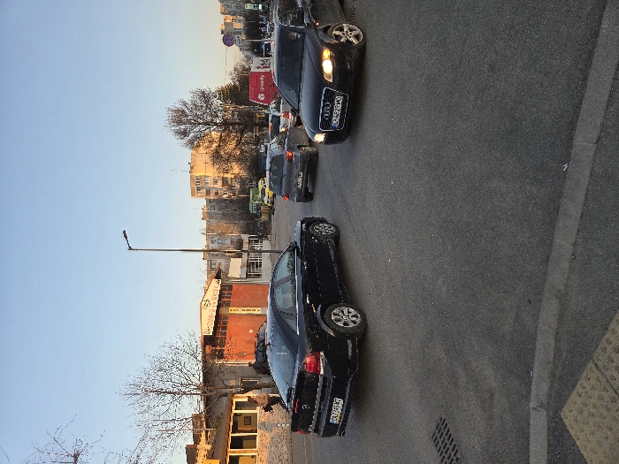 This image depicts an urban street scene in Sofia, Bulgaria, characterized by vehicle traffic and diverse architecture. The time of day appears to be late afternoon or early morning, indicated by the warm, directional sunlight and clear sky. In the foreground, a black Opel Vectra C sedan with Bulgarian license plate C4234MX is angled towards the left, displaying its rear. To its right, a black Audi A4 B7 sedan (Bulgarian license plate CB 5528 MX) faces forward with its headlights illuminated. Behind the Opel, a grey hatchback is visible, partially obscured. A red "Speedy" courier van is positioned behind the Audi, further right. Several other vehicles are present in the background. To the left, a light-colored building with large windows is visible, possibly a shop or cafe. Adjacent to it is a distinctive red-orange building featuring three garage bays and a sign in Cyrillic, "ГУМИ-АВТО ЧАСТИ," indicating a "Tires-Auto Parts" service. Two individuals are present on the sidewalk near the light-colored building. The background consists of several multi-story residential apartment buildings, typical of the region, under a clear blue sky. A tall, dark street light pole stands prominently in the midground. The asphalt road surface shows wear, and a metal drainage grate is visible in the bottom left. A concrete curb separates the road from the sidewalk, which includes a yellow tactile paving section in the bottom left corner. Bare deciduous trees are scattered throughout the scene, suggesting a colder season.