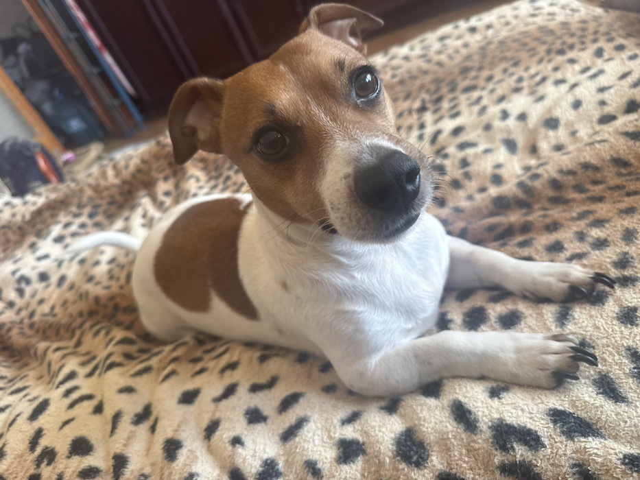 A small dog is depicted lying on its back on a leopard-print blanket. The dog possesses a primarily white coat with distinct brown patches; a prominent, irregularly shaped brown patch is visible on its back, and its head is mostly brown with white fur around the muzzle. Its eyes are dark, and its nose is black. The dog's forelegs and hind legs are visible, extended, with dark claws. The animal is oriented with its head towards the top right of the frame, looking directly upwards at the camera with a slight head tilt. The leopard-print blanket features tan and brown spotted patterns and occupies the majority of the frame. In the upper right background, a dark brown wooden furniture piece, possibly a dresser or shelf unit, is partially visible and out of focus. Additional blurred, indistinct objects with varying colors are present further in the background. The scene is illuminated by ambient light, creating soft shadows. This event occurred in an unspecified indoor location within the city of Makiivka, Ukraine.